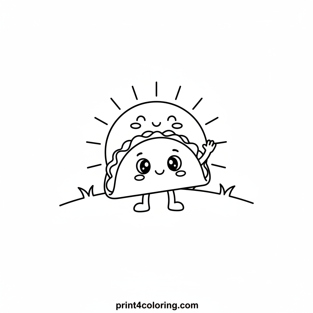 Meet our super cute, smiling taco friend! With big, friendly eyes and rosy cheeks, this happy taco is waving hello from a simple grassy hill. A bright, friendly sun shines down on this cheerful scene, ready for your colorful imagination to bring it to life. Grab your crayons and make this taco's day extra vibrant!