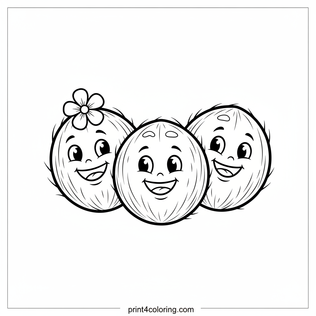 - 2🖍️ Coconut Expressions - Give each coconut its own unique shade of brown or green, and make sure their happy faces stand out with a darker outline or a bright color for their smiles.