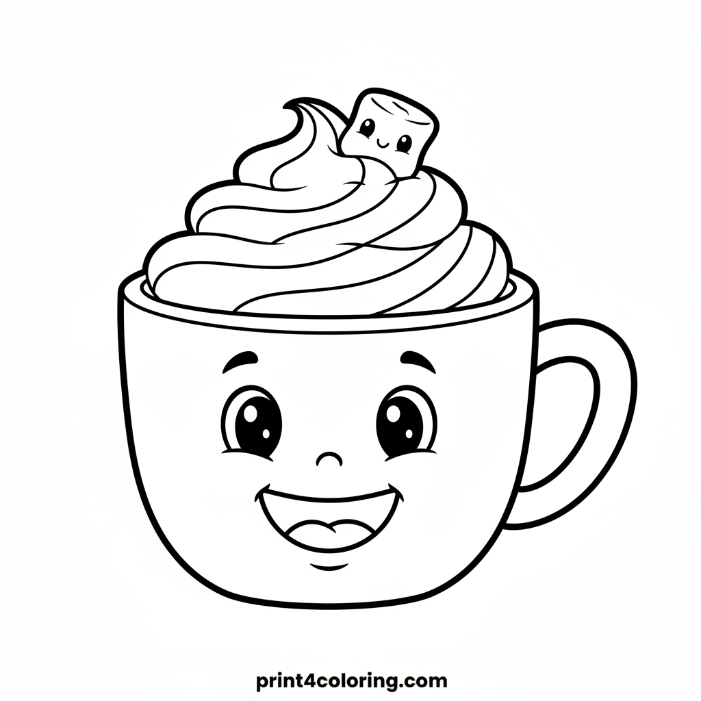 Warm up with this delightful coloring page featuring a close-up portrait of a cheerful hot chocolate mug! This happy little friend has a big, friendly smile, cute eyes, and is topped with a fluffy swirl of whipped cream and an even happier marshmallow. A perfect cozy scene to bring to life with your favorite colors!