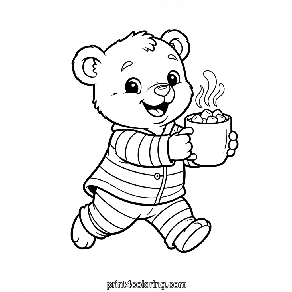 Imagine a super happy bear cub, all cozy in soft pajamas, snuggled deep under a fluffy blanket. This adorable bear is holding a giant, steaming mug of hot chocolate, overflowing with yummy marshmallows! Get ready to bring this heartwarming scene to life with your favorite colors, making it extra snuggly and sweet.