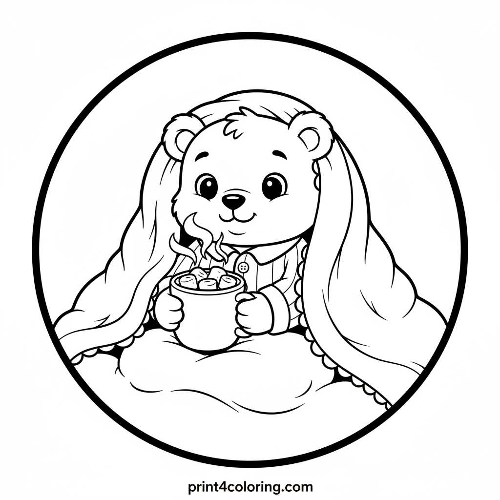 Get ready for a snuggly adventure! This adorable coloring page features a happy bear cub in soft pajamas, tucked cozy under a fluffy blanket. He's enjoying a steaming mug of hot chocolate, piled high with yummy marshmallows. Perfect for a warm and fuzzy coloring time!