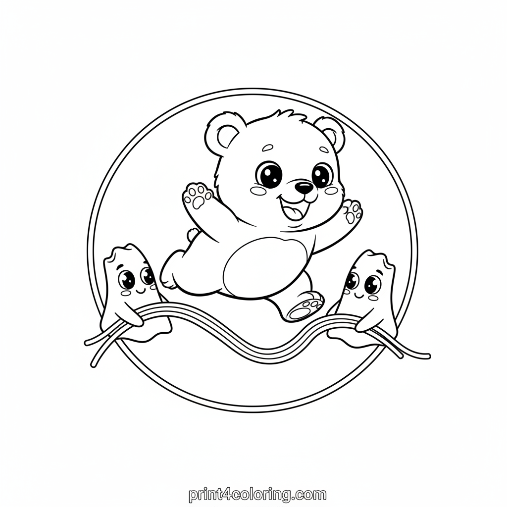 Join a playful bear cub as it leaps with joy over a long, wavy spaghetti noodle! Two cheerful, blob-like noodle friends hold the ends, making for a super silly and energetic jump rope game. This cute and cozy scene is perfect for adding vibrant colors and imagining delicious fun. Get ready to skip into a world of pasta-tastic adventure!