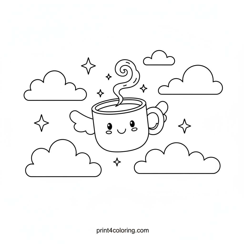 Soar through a magical sky with a friendly, smiling mug! This whimsical mug has tiny sparkly wings and glides past fluffy marshmallow clouds and twinkling stars. Help it leave a dazzling trail of swirly, sparkling steam. Get ready for an enchanting coloring journey high above the world!
