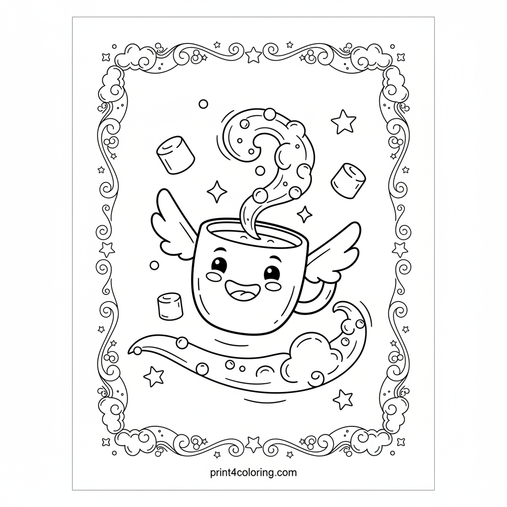 Soar into a magical sky with our friendly flying mug! This happy little cup has sparkly wings and is on an amazing adventure, leaving a trail of shimmering steam. Color the fluffy marshmallow clouds and twinkling stars all around as it glides through the sky. An enchanting scene awaits your colors!