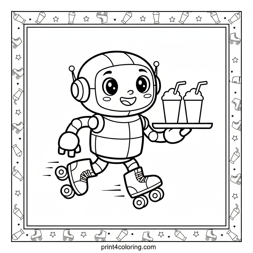 Get ready for a delicious delivery! Meet our friendly robot, zooming on roller skates with a tray of two super frothy, yummy milkshakes. Imagine the fun colors you can use for the robot's shiny parts, the creamy drinks, and the speedy blur as it races to bring a tasty treat. Perfect for little artists who love robots and sweet treats!