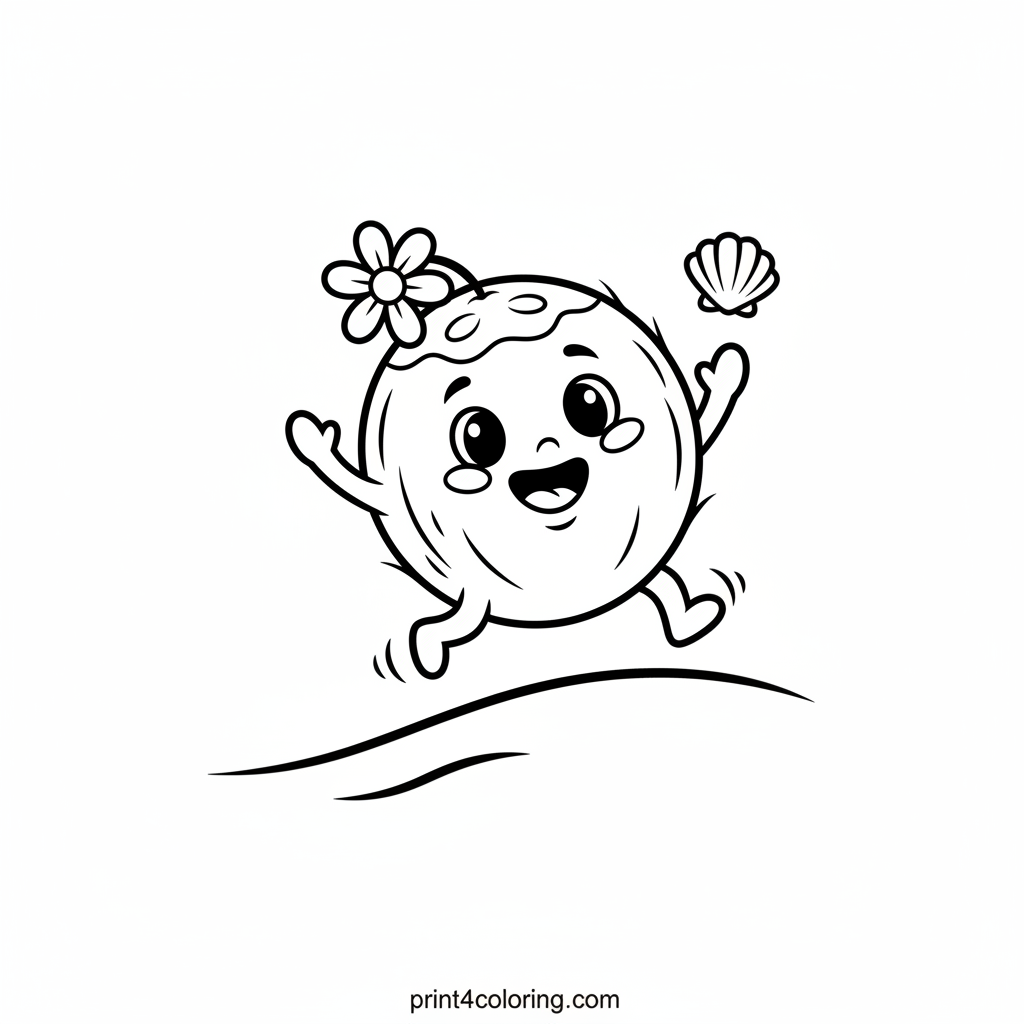 Meet our happy coconut friend, enjoying a perfect beach day! With big, friendly eyes and a tiny flower adorning its head, this sweet coconut is relaxing blissfully on a soft, warm sand dune. A single pretty seashell rests nearby, adding to the peaceful tropical scene. Grab your crayons and bring this sunny picture to life!