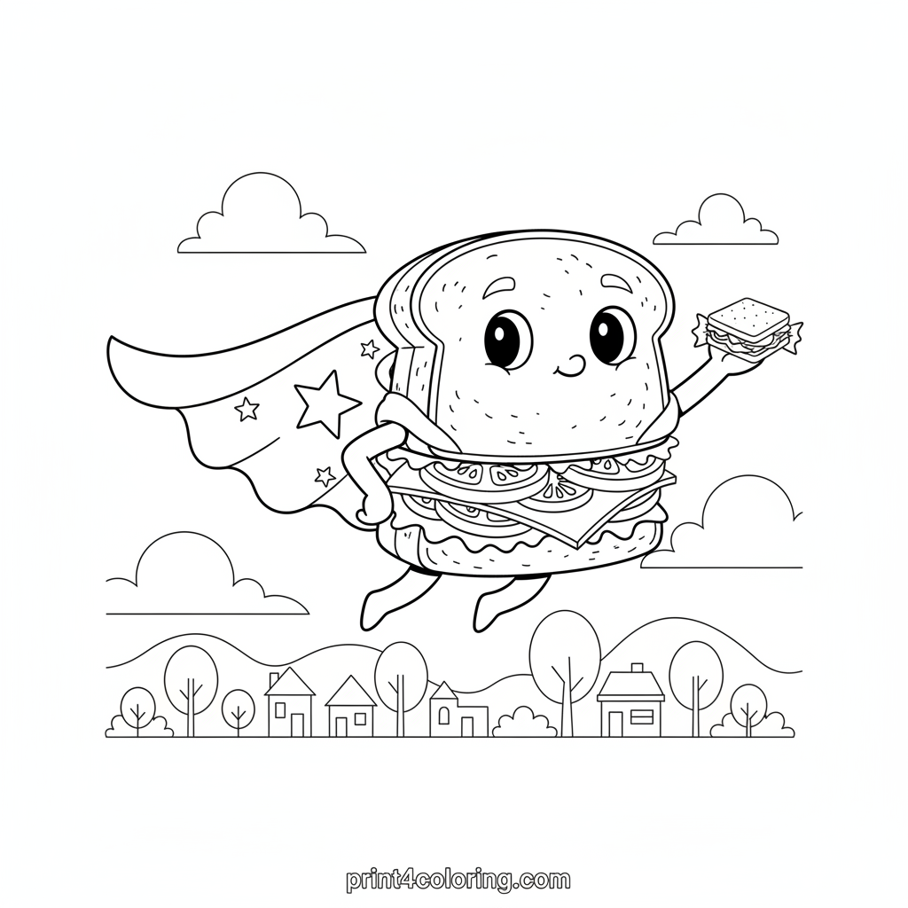 #sandwich#superhero#flying#food#delivery#adventure#lunch#cape#fantasy#coloring-page#printable