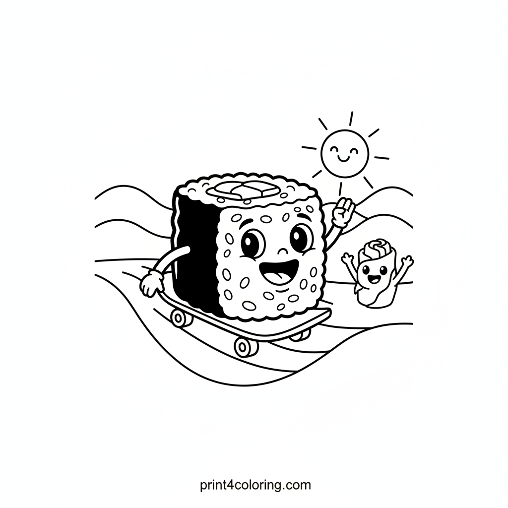 Join our super cool, smiling sushi roll as it zips down a fun, wavy ramp on tiny wheels! Watch as a happy piece of ginger cheers from the sidelines, adding to the excitement of this delicious adventure. Grab your crayons and bring this awesome scene to life!