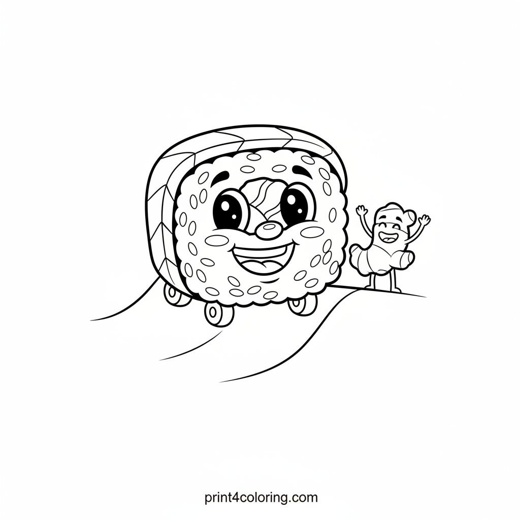 Get ready for a delicious ride! This coloring page features a super-cool, smiling sushi roll character expertly skateboarding down a gentle, wavy ramp. Watch out for the friendly, happy piece of ginger cheering on the side, adding to the fun of this tasty adventure. Grab your colors and bring this zesty scene to life!