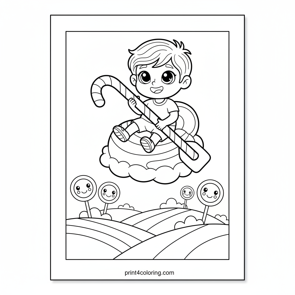 Float into a world of pure imagination! A joyful child is on an enchanting journey, gently sailing on a fluffy ice cream cloud. They use a giant candy cane to paddle over a delightful landscape of candy hills and cheerful trees. Get ready to add your sweetest colors to this whimsical dream!