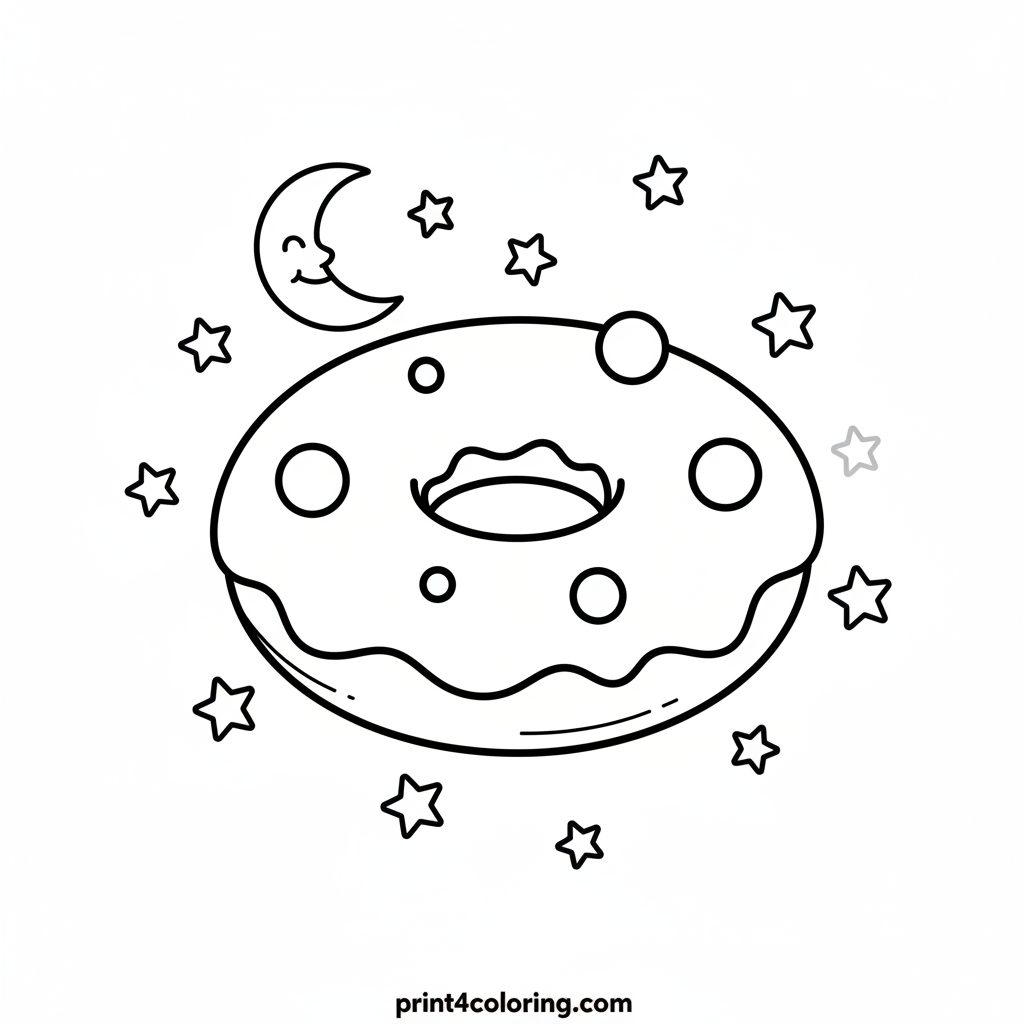 Imagine a fluffy, cloud-like donut, topped with soft frosting and colorful sprinkles, floating gently in a magical starry night sky! Tiny stars and a friendly crescent moon twinkle around it. This whimsical scene is ready for you to bring to life with your favorite colors.
