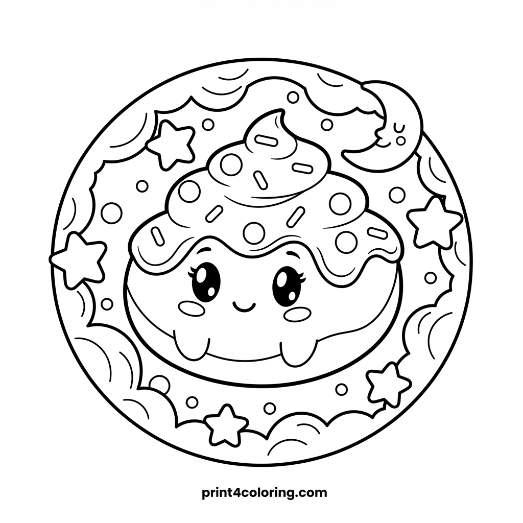 Imagine a super soft, fluffy donut, just like a cloud, floating high in a magical night sky! It's covered in yummy frosting and colorful sprinkles, with tiny stars and a crescent moon twinkling all around. Get ready to add your favorite colors to this sweet, dreamy scene and bring it to life!