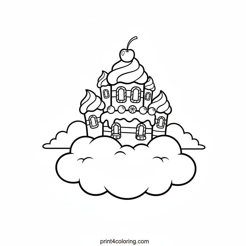 Imagine a magical castle made entirely of delicious cake, gently floating on a fluffy cloud! Its turrets are frosted, windows sparkle with candy, and a shiny cherry sits proudly on top. This whimsical scene invites you to add vibrant colors to its sugary walls and dreamy skies. A sweet adventure awaits!