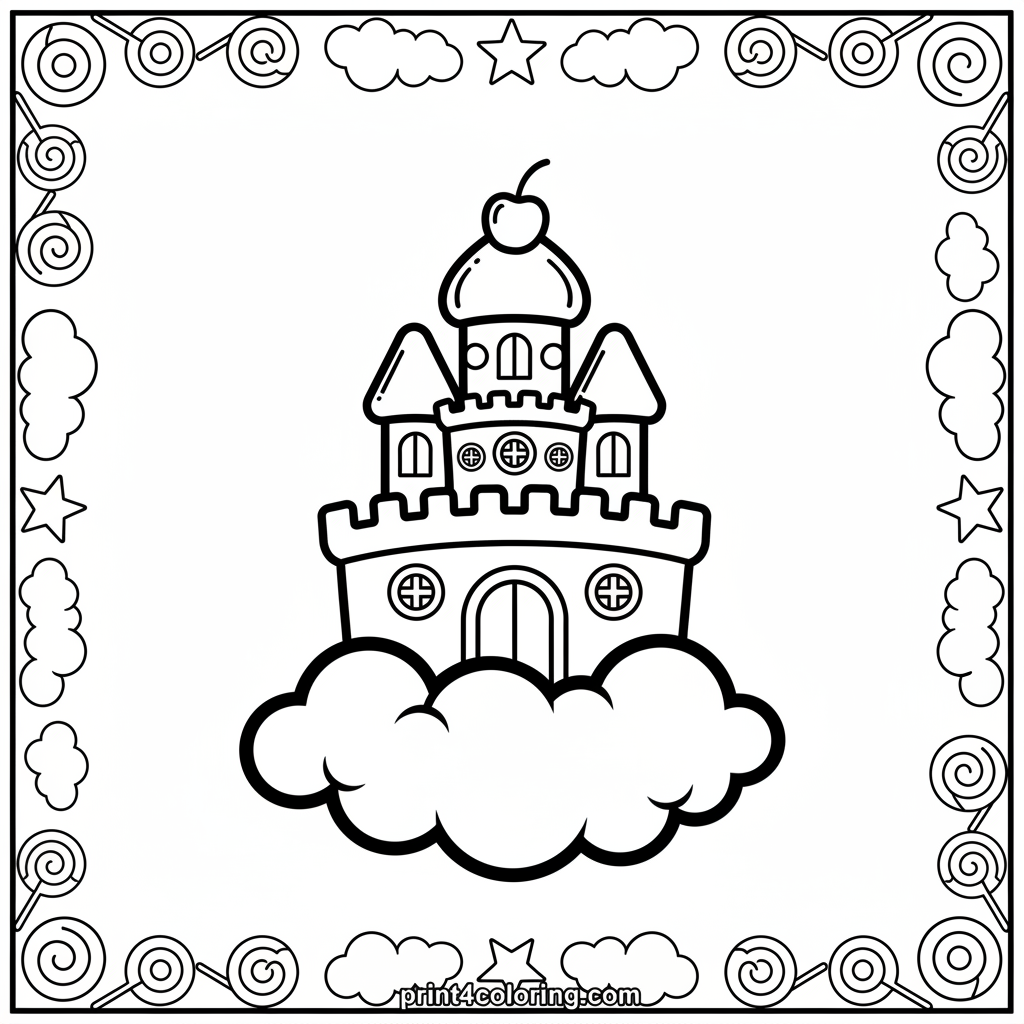 Imagine a castle made of the yummiest cake, floating high above the clouds! This magical fortress has turrets of swirly frosting, windows sparkling with candy, and a shiny cherry on its highest peak. It gently drifts on a fluffy, white cloud, waiting for you to bring its delicious world to life with your brightest colors. Get ready for a sweet coloring adventure!