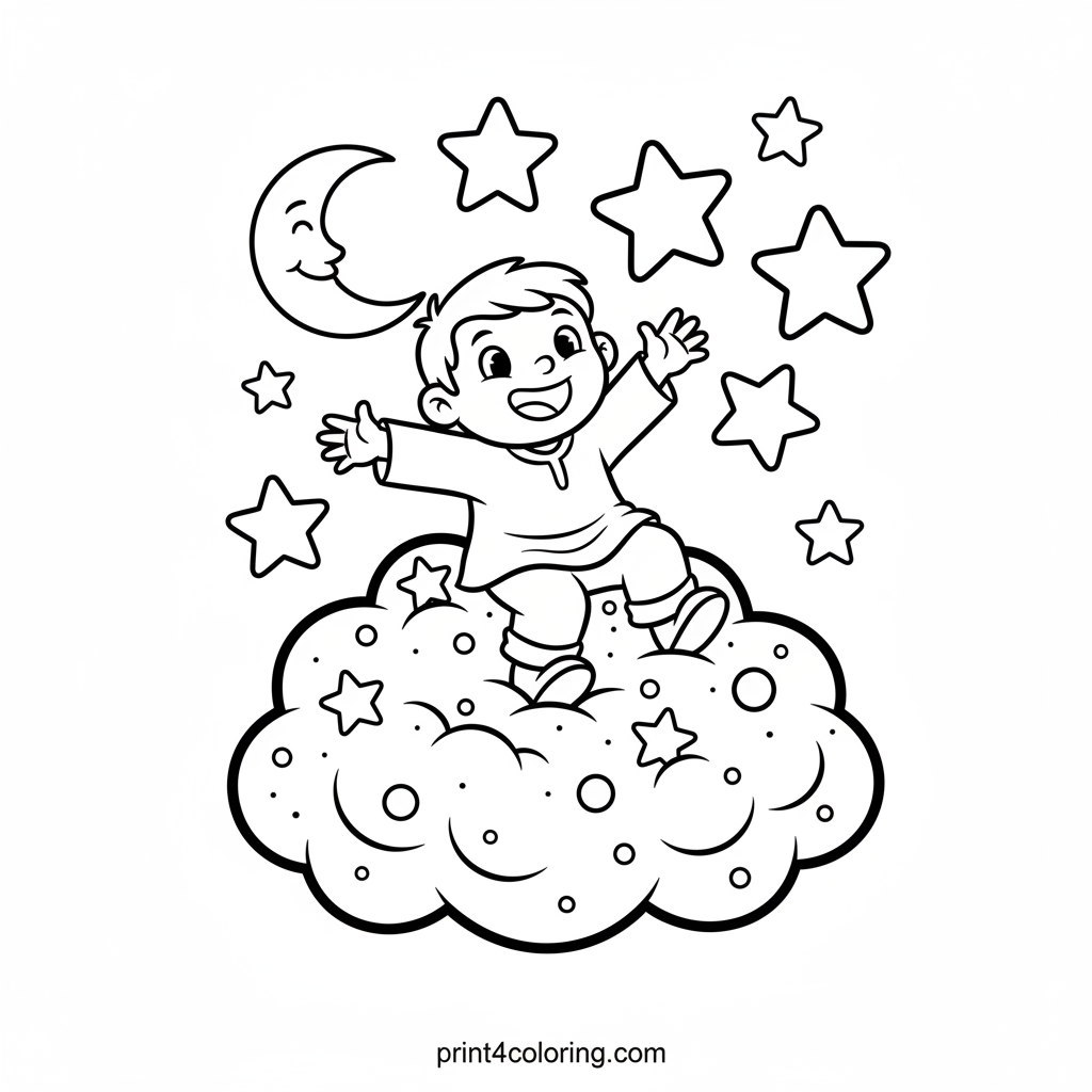 Soar into a magical world where a happy child floats gently on a giant, fluffy rice pudding cloud! Reach out and catch sparkling, edible stars in a whimsical night sky. This enchanting scene invites you to add vibrant colors to a delightful dream adventure.