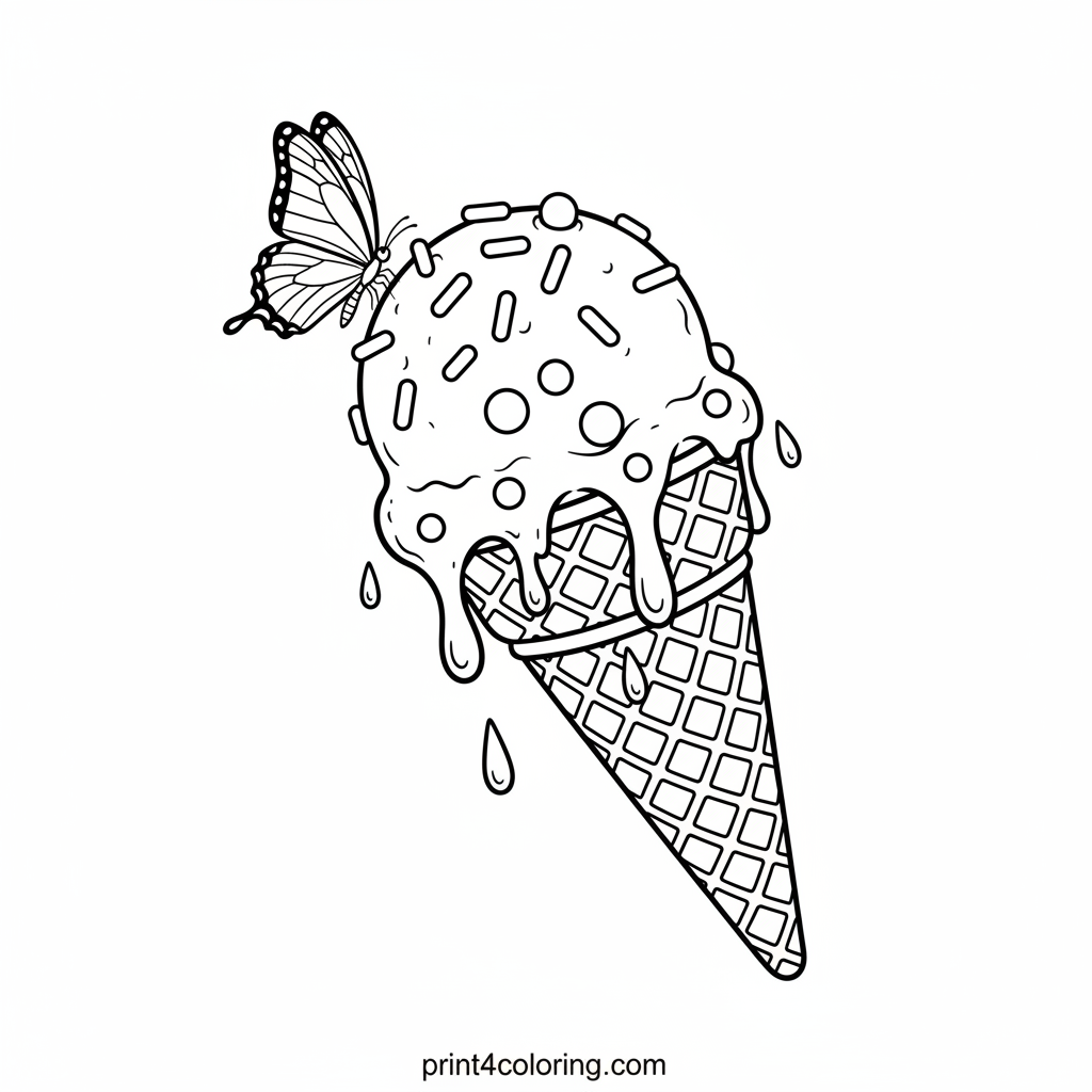 Explore a delicious, melting ice cream cone, showcasing intricate waffle texture, tiny sprinkles, and delicate drips. A graceful butterfly has found the sweetest spot to rest, adding a touch of nature's beauty to this delightful treat. Get ready to add vibrant colors to this masterpiece of sweetness!
