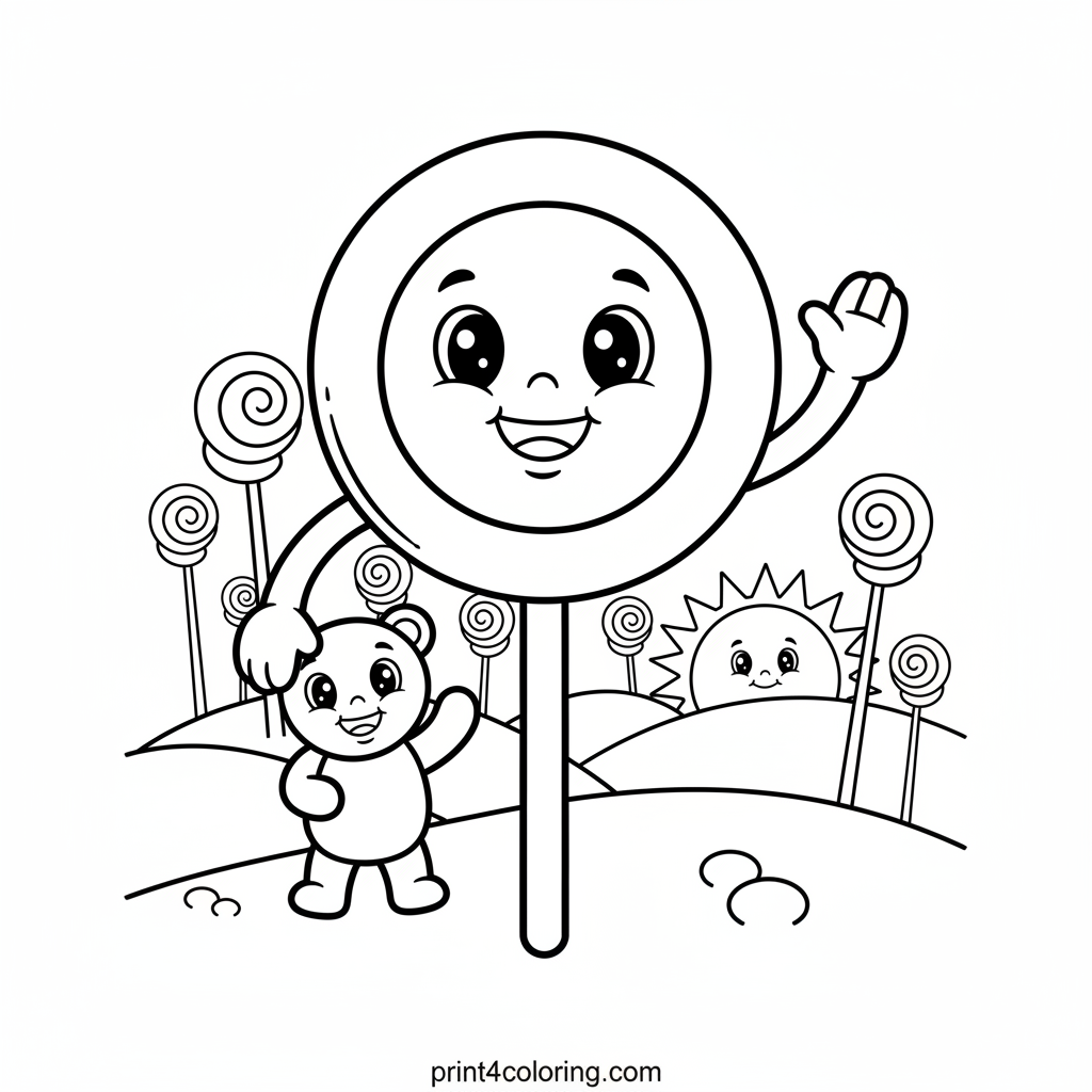 Join a big, happy lollipop with a friendly smile and sturdy stick as it gently holds a tiny, cheerful gummy bear. Both are waving hello, ready for you to bring their sweet world to life with your favorite colors! This delightful scene is perfect for little artists.