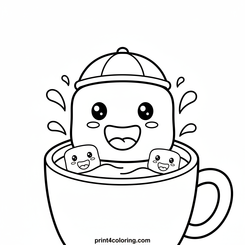 Get ready for a splash of fun! This adorable coloring page features a brave little marshmallow, sporting a tiny swim cap, doing a hilarious cannonball dive into a giant mug of hot chocolate. Watch out for the other giggling marshmallows cheering from the rim! It's a sweet and silly scene perfect for imaginative coloring adventures.