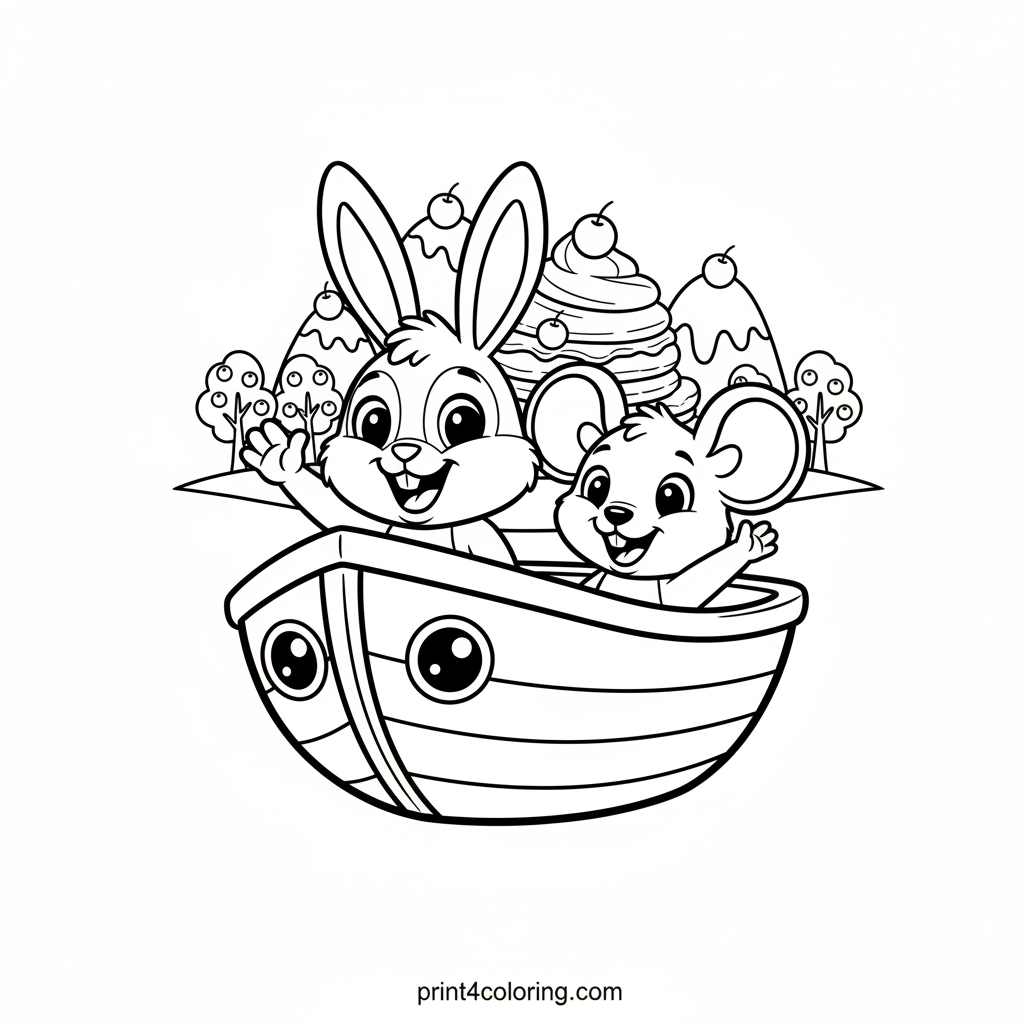 Embark on a delicious journey with a friendly boat carrying a curious bunny and a tiny mouse! They're sailing towards a wondrous island made entirely of fluffy pancakes, topped with snowy whipped cream mountains and trees bursting with juicy berries. Get ready to add vibrant colors to this sweet, dreamy adventure!