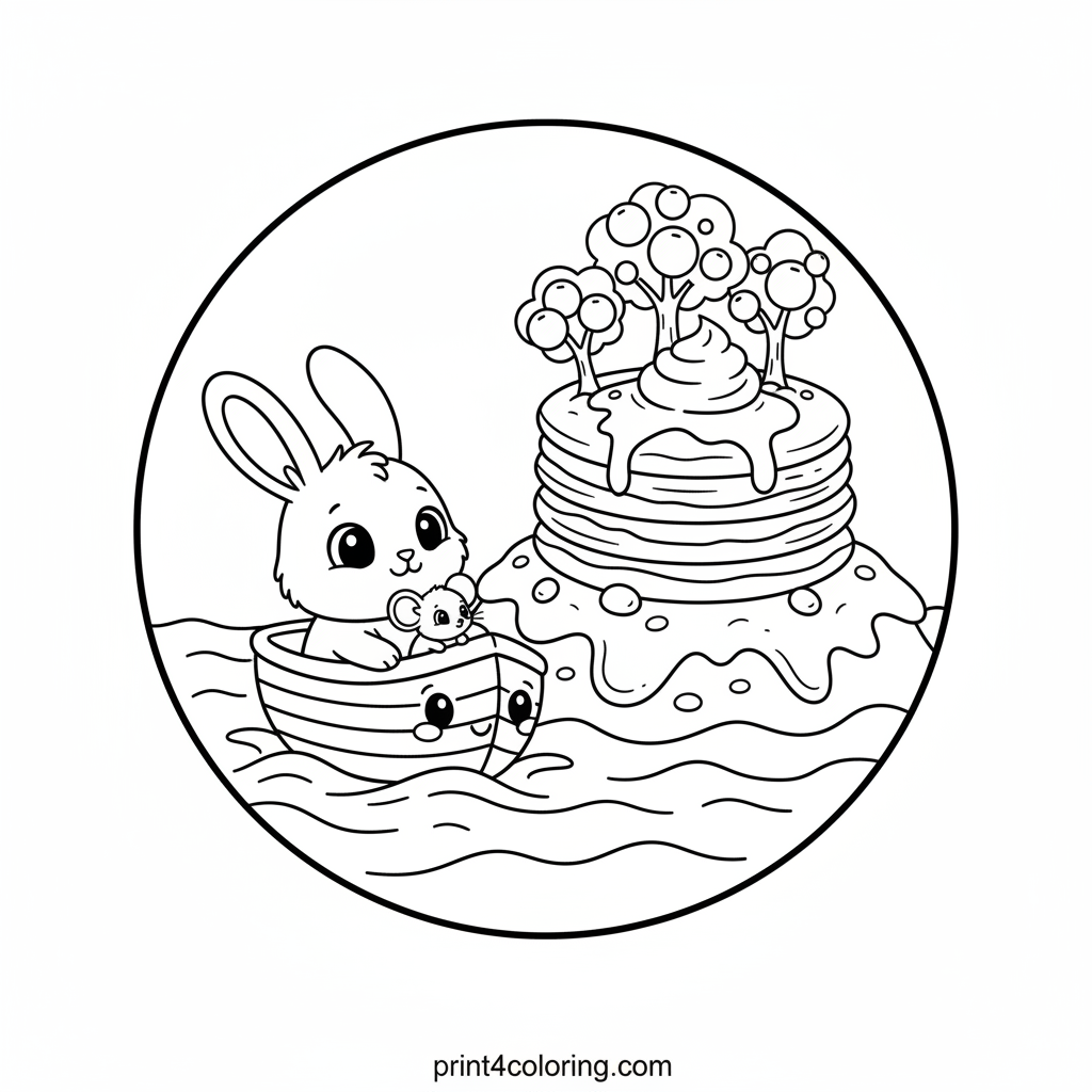 Join a cheerful bunny and a brave little mouse on an exciting boat trip! They're sailing across a yummy sea towards a fantastical island made of fluffy pancakes, topped with snowy whipped cream peaks and juicy berry trees. Imagine the delicious colors you can use to bring this sweet adventure to life!