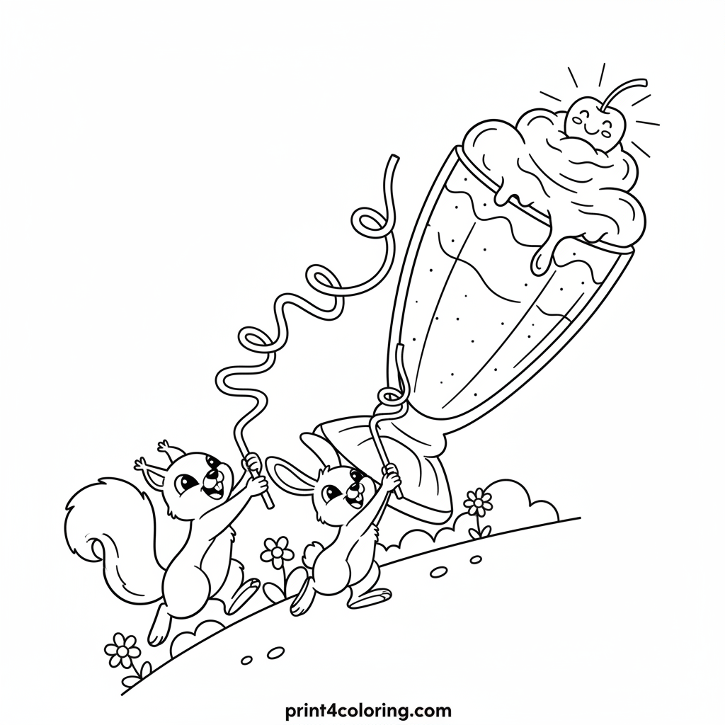 Join a cheerful squirrel and a cute bunny on an extraordinary adventure! They're using super-long, swirly straws to slurp from a towering milkshake mountain, topped with fluffy whipped cream clouds and a bright cherry sun. Imagine all the delicious flavors as you bring this sweet, whimsical scene to life with your colors!