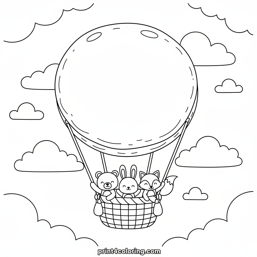 Embark on a delightful sky adventure! A giant, fluffy pancake floats gently amidst soft, puffy clouds, much like a cozy hot air balloon. Look closely to spot a tiny berry basket dangling underneath, carrying a crew of happy animal friends on an unforgettable journey through the sweet, blue skies.