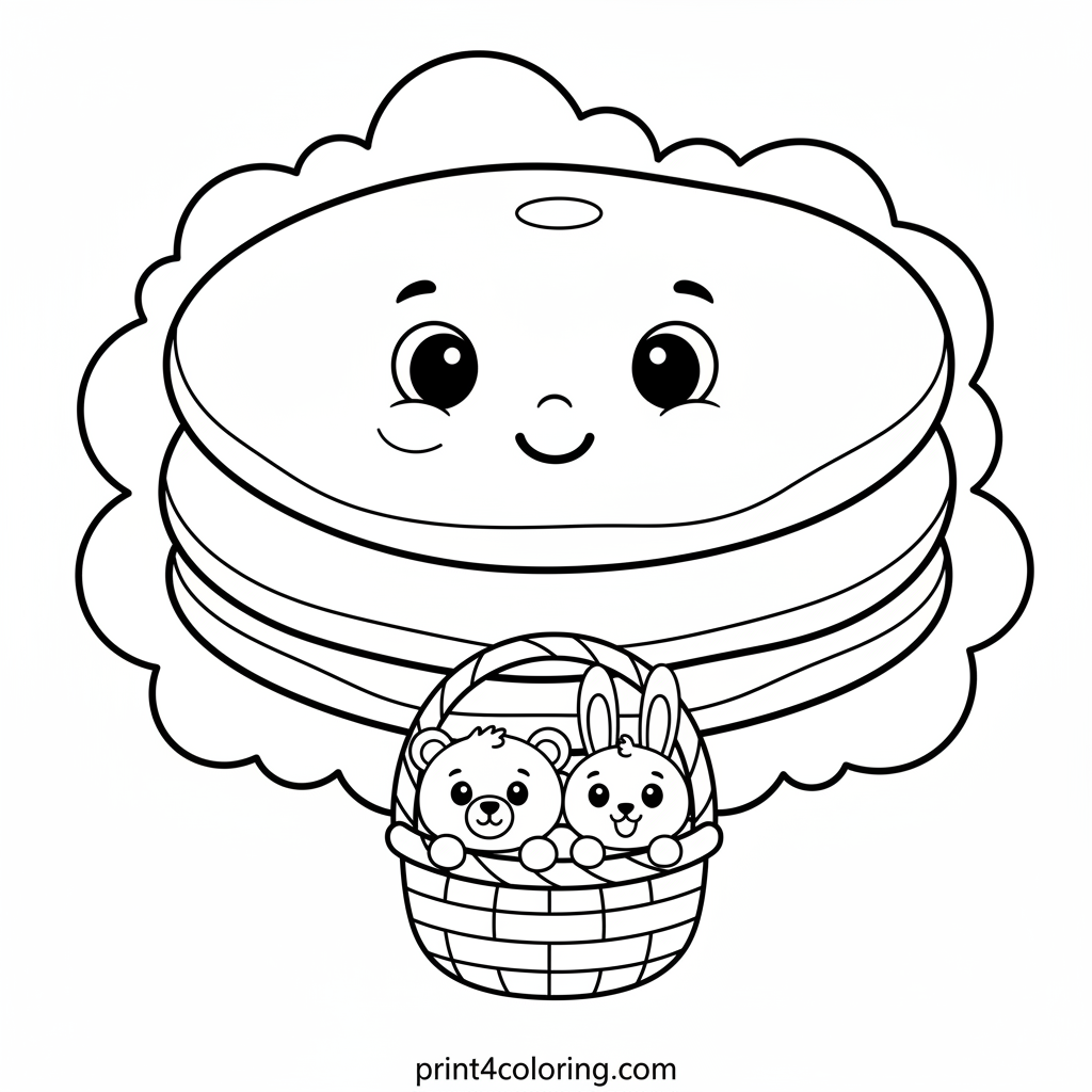 Imagine a giant, golden pancake floating high above the world! This fluffy delight soars through soft, puffy clouds, acting like a magical hot air balloon. Tiny, happy animal friends enjoy their sweet sky adventure, nestled safely in a berry basket below. A whimsical journey awaits your colors!