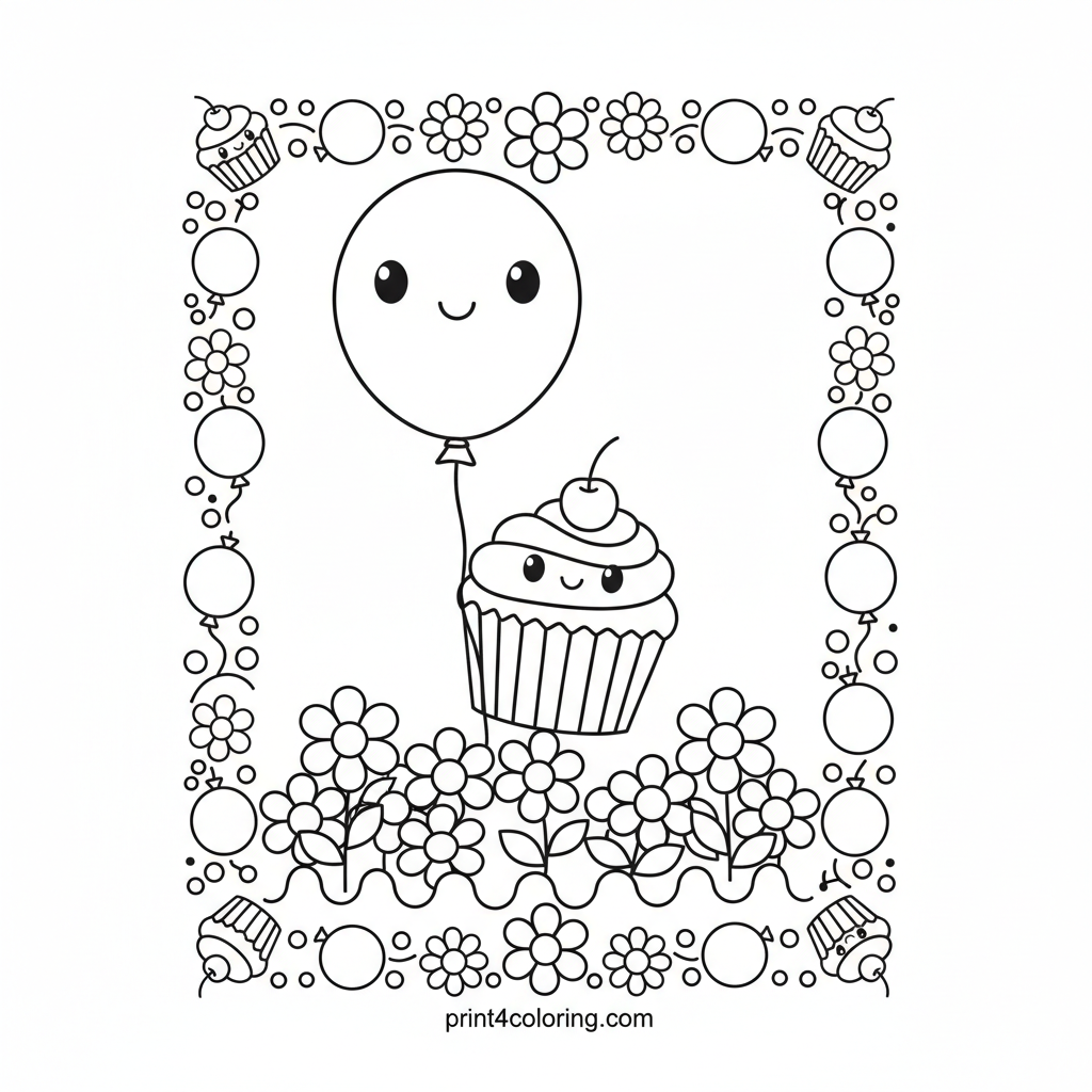 Embark on a sweet sky journey with a cheerful cupcake! Carried by a big, round balloon, it floats happily above a vibrant field of colorful flowers. This delightful scene, framed by playful patterns, invites you to bring it to life with your favorite bright colors.