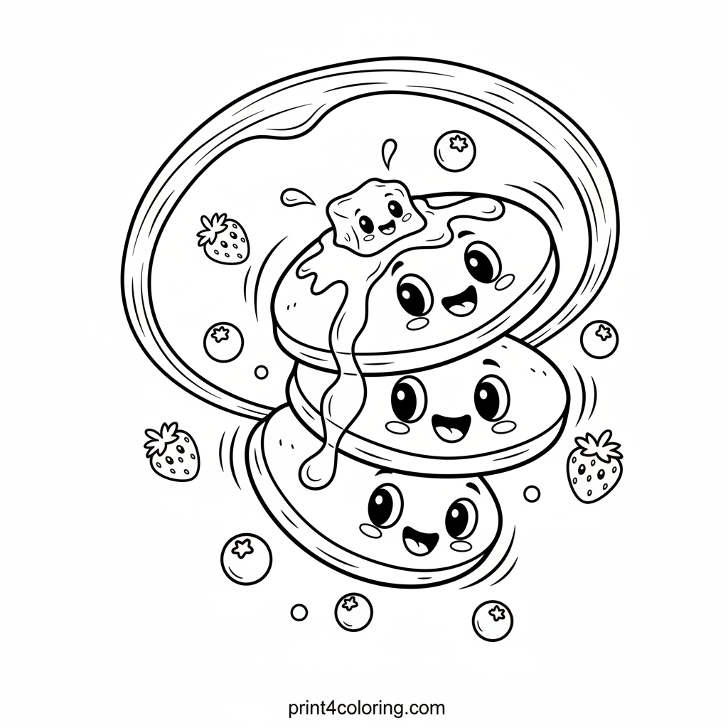 Get ready for a delicious adventure with this wobbly stack of happy pancakes! Each pancake has a big smile and friendly eyes, topped with a melting pat of butter. Juicy berries and sweet syrup drizzle all around, waiting for you to bring them to life with your brightest colors. A truly joyful breakfast scene!