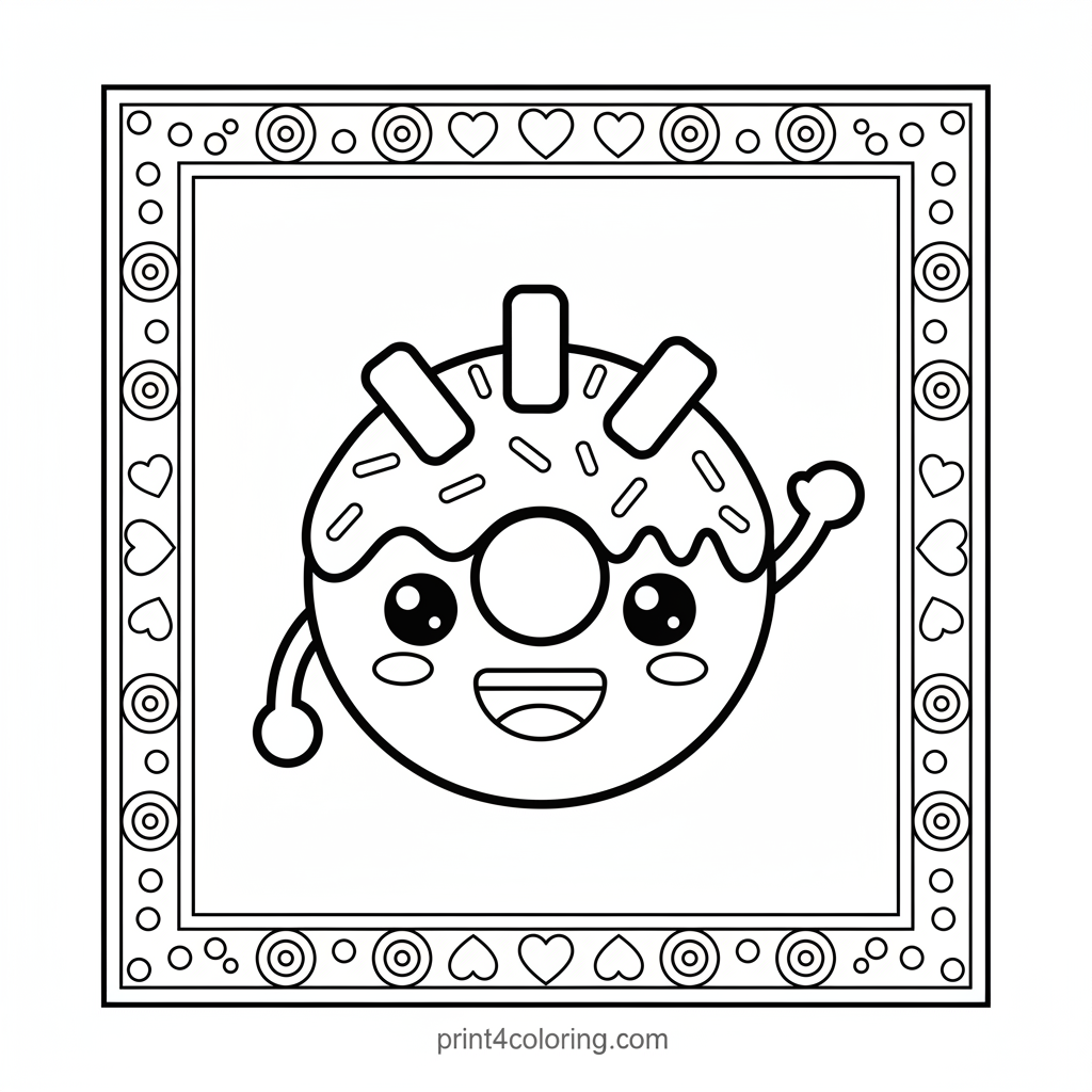 Meet your new sweetest friend, a happy donut with a big smile and sparkling eyes! This delightful treat is covered in colorful sprinkles and gives a friendly wave. Get ready to bring this adorable donut to life with your favorite colors, making it super yummy and fun to color for everyone!