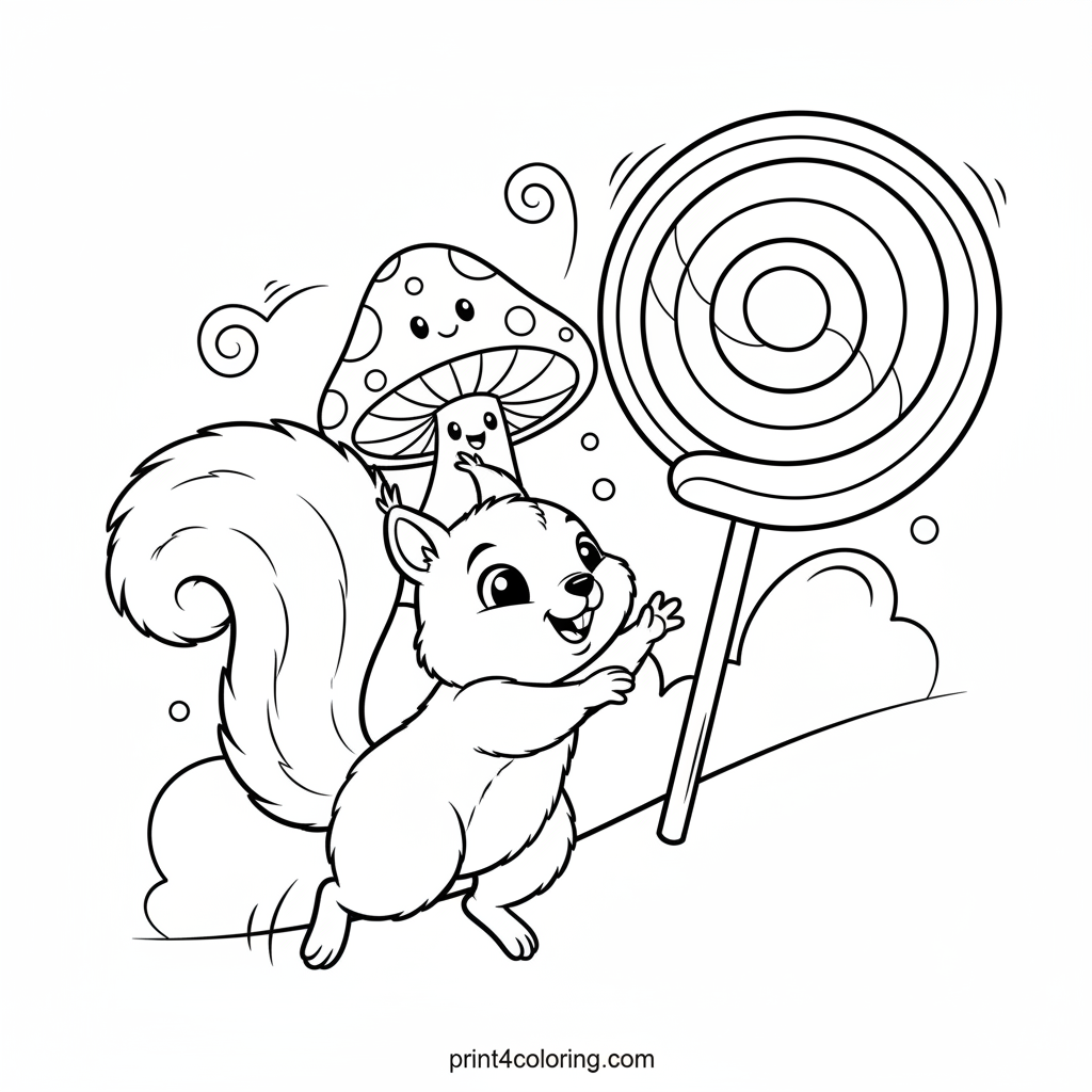 Imagine a super cute, fluffy squirrel with a magnificent bushy tail, perched joyfully on a friendly mushroom! This happy little friend is holding an enormous, swirly rainbow lollipop, its eyes sparkling with pure delight. Get ready to add vibrant colors to this sweet scene and bring the squirrel's treat to life!