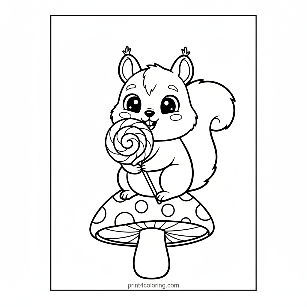 Get ready to color a truly delightful scene! This adorable, fluffy squirrel with a big bushy tail is perched on a friendly mushroom, holding a giant, swirly rainbow lollipop. Its eyes sparkle with pure joy, inviting you to add vibrant colors to its sweet treat and make this charming forest friend come alive!
