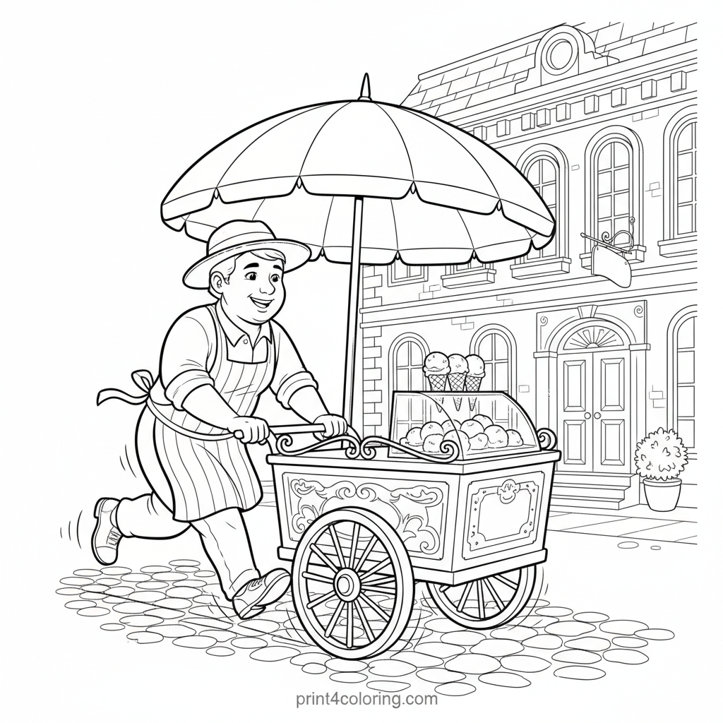Embark on a delightful journey down a charming cobblestone street with a friendly vendor gently pushing a beautifully ornate vintage ice cream cart. Its striped umbrella adds a cheerful touch, while a grand historical building stands proudly in the background. Get ready to add vibrant colors to this bustling, detailed scene!