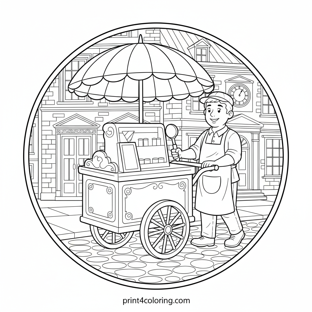 - 1🎨 Ornate Details - Use fine-tipped markers or colored pencils to bring out the intricate patterns on the ice cream cart and its wheels.