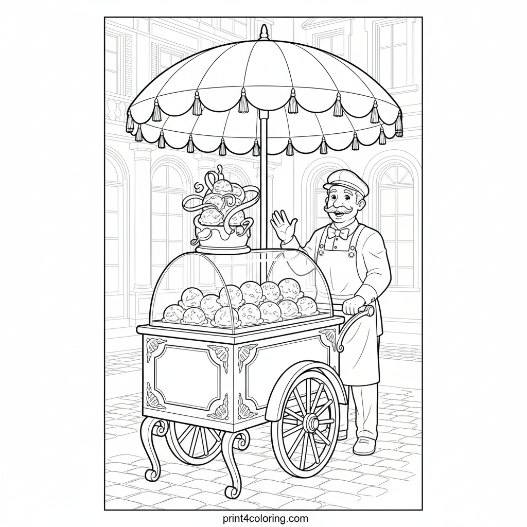 Travel back in time with a friendly vendor pushing an ornate vintage ice cream cart down a charming cobblestone street. This detailed scene features a cheerful striped umbrella, inviting treats, and a classic historical building facade in the background. A delightful challenge for expert colorists.