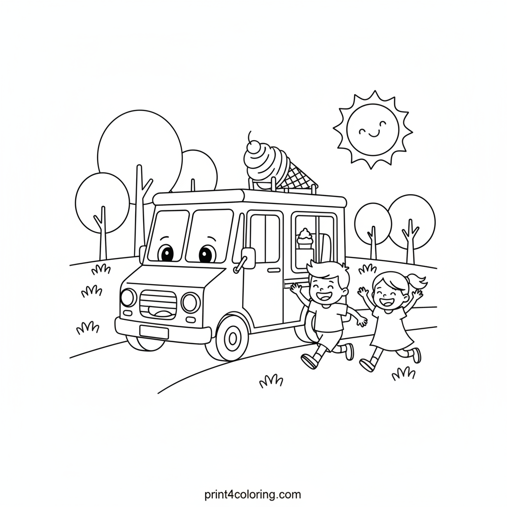 Imagine a bright, smiling ice cream truck rolling through a sunny park! Its big wheels are turning slowly as two happy children excitedly run alongside, waving their hands for a delicious treat. This delightful scene is full of joy and the promise of yummy flavors. Get ready to color a sweet adventure!