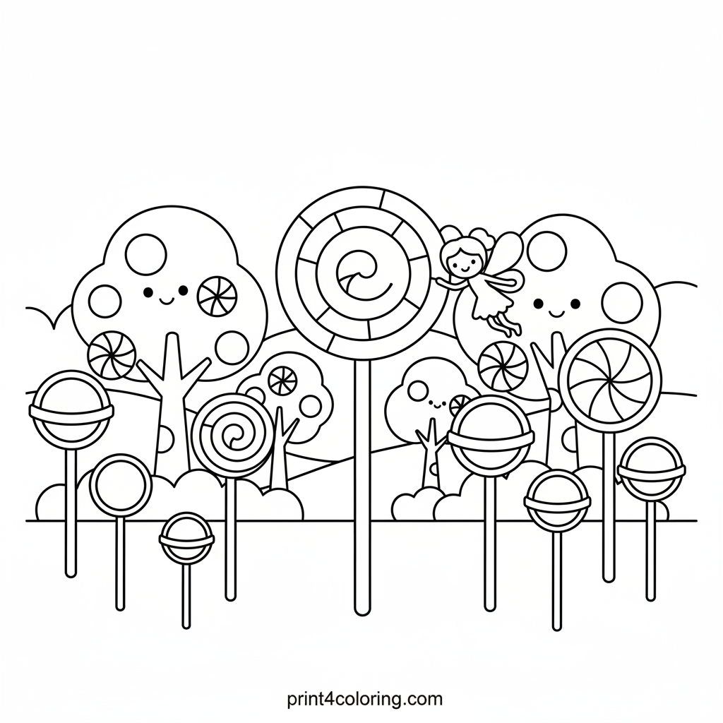 Step into a fantastical candy garden where delightful lollipop flowers burst with color and friendly trees boast yummy candy leaves. A tiny, joyful fairy with shimmering wings flits near a giant, swirly lollipop, inviting you to add vibrant hues to this magical, sugary dreamland. Get ready for a sweet coloring adventure!