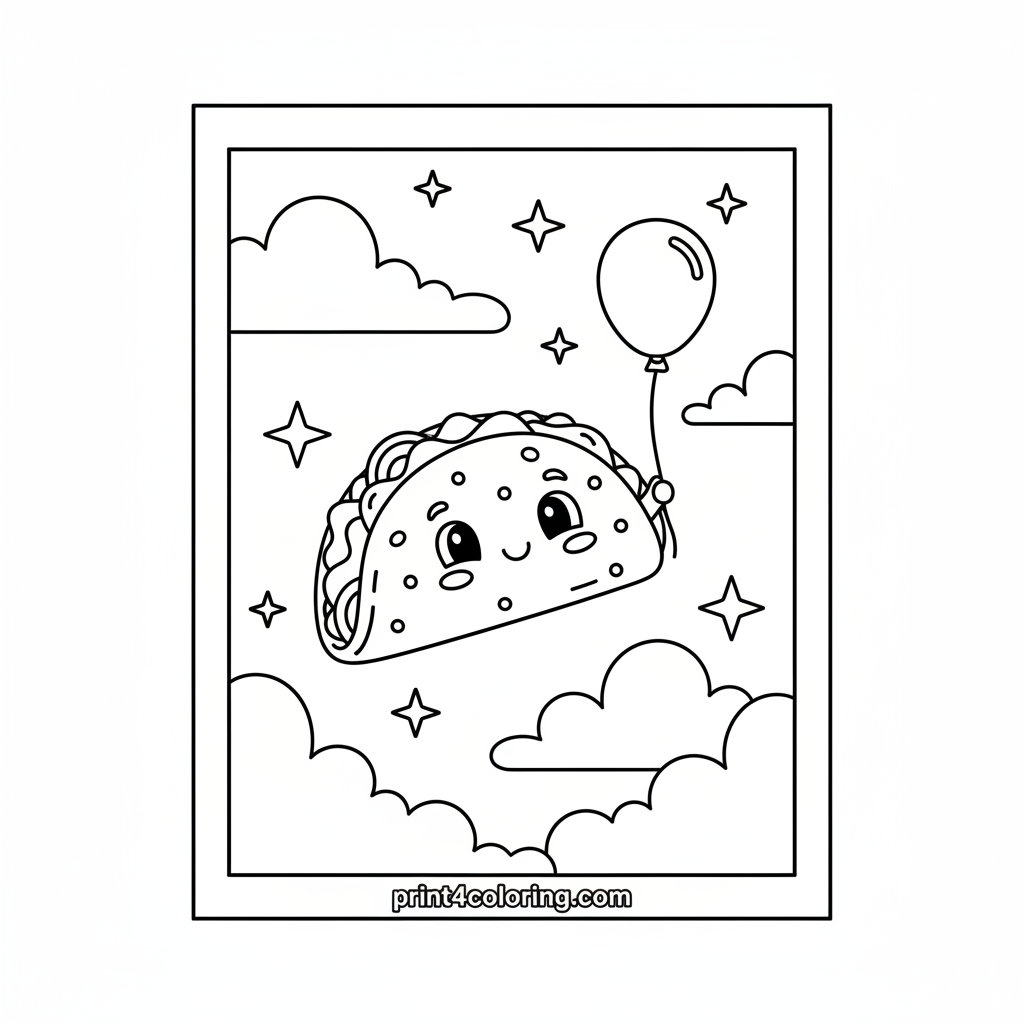 Join our cheerful taco friend on a magical journey through the sky! This happy taco is peacefully dreaming, gently floating amidst fluffy cartoon clouds and twinkling stars, holding onto a tiny, colorful balloon. Imagine all the wonderful colors you can use to bring this whimsical dream scene to life!