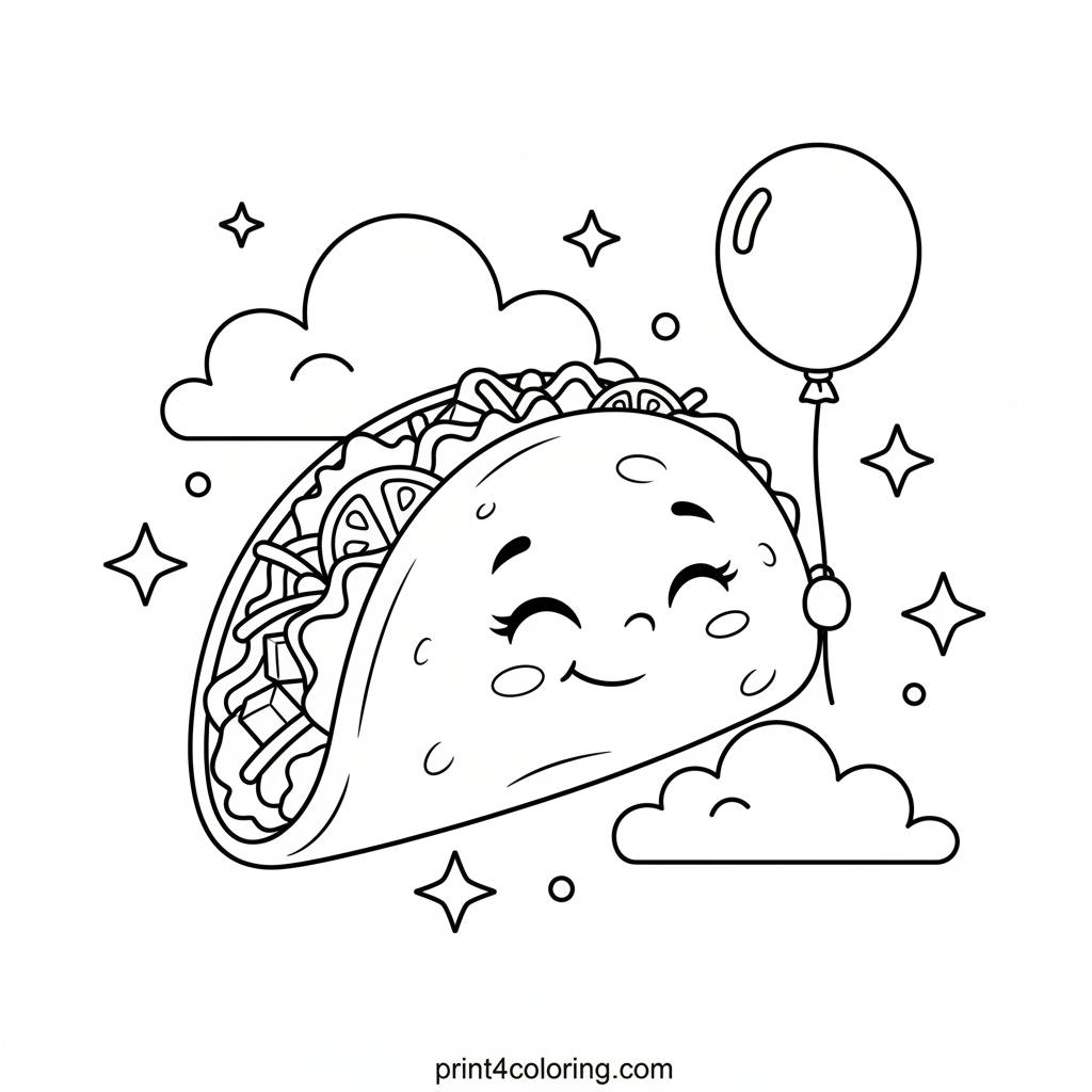 Imagine a happy taco gently drifting through a whimsical sky! This close-up portrait shows our smiling taco friend, peaceful in its dreams, surrounded by fluffy cartoon clouds and twinkling stars. It even holds a tiny, colorful balloon string, ready for a magical journey. Get ready to add vibrant colors to this delightful dream scene!