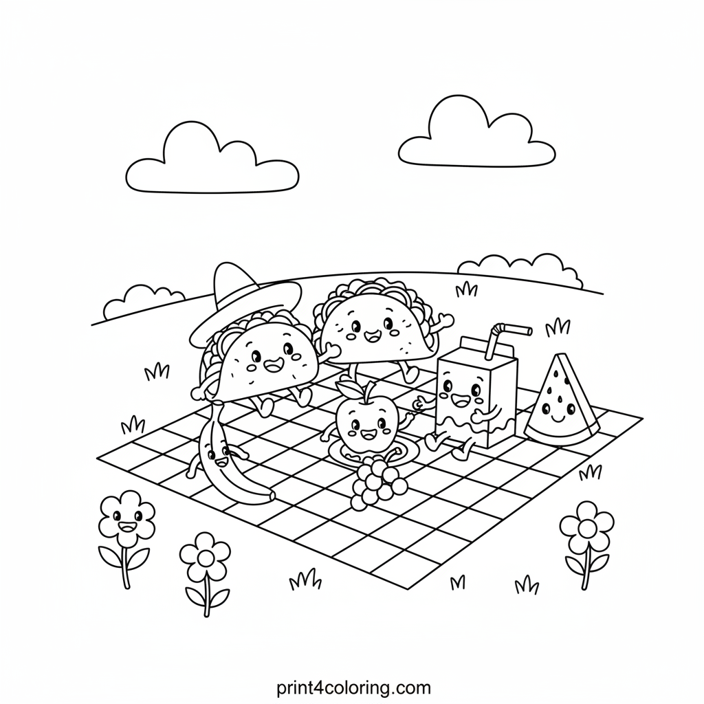 Join a fiesta of flavor with this fun coloring page! A group of happy, smiling tacos are enjoying a sunny picnic on a cozy checkered blanket. They're joined by other cheerful friends like a giggling juice box and a happy apple, all ready for you to add vibrant colors to their joyful outdoor feast!