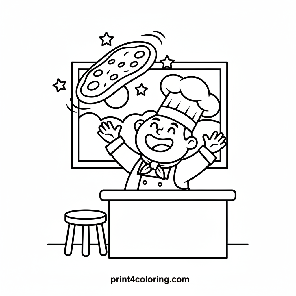 Join our cheerful cartoon chef as he performs an amazing pizza dough acrobat show! Watch him joyfully toss a giant, round pizza dough high into the air, making it spin and twinkle with stars. This fun scene is waiting for your creative colors to bring it to life. Get ready to make some delicious art!