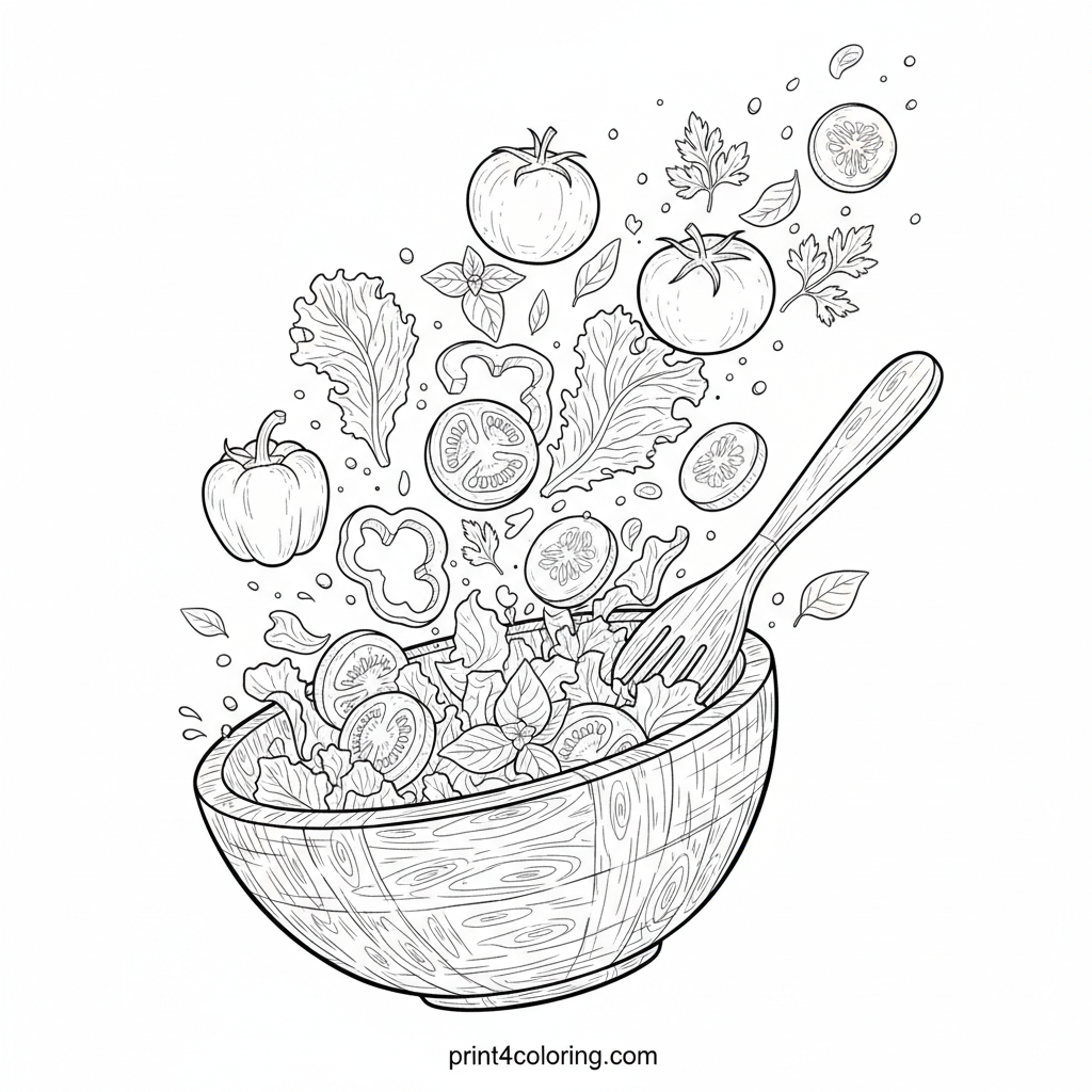 Dive into a vibrant scene of a rustic wooden bowl brimming with nature's bounty! This detailed coloring page features crisp lettuce, juicy heirloom tomatoes, cool cucumbers, colorful bell peppers, and fragrant herbs, all meticulously arranged. A wooden salad server awaits, ready to serve this fresh, healthy feast.