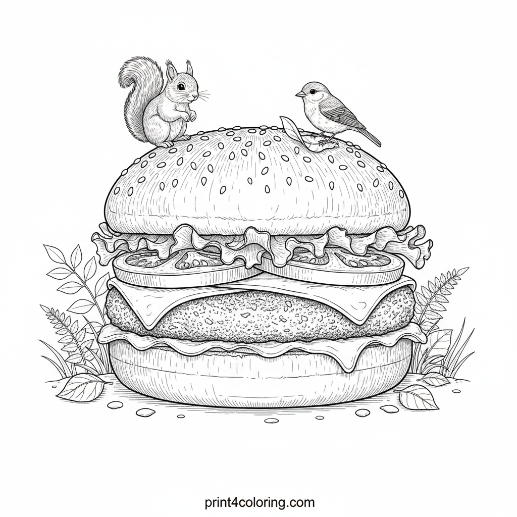 #giant-burger#woodland-animals#fantasy-food#nature-scene#coloring-page#printable