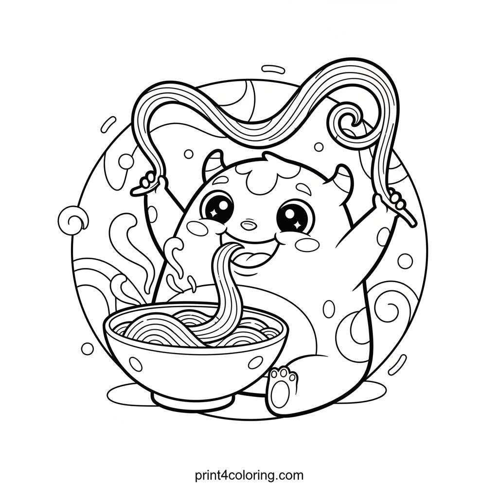 Meet the friendliest monster in town, enjoying a giant bowl of delicious, wiggly noodles! With big, happy eyes and outstretched arms, this cute creature is slurping up a super long noodle. Imagine all the fun colors you can use to bring this cozy scene to life. A perfect page for a happy coloring adventure!