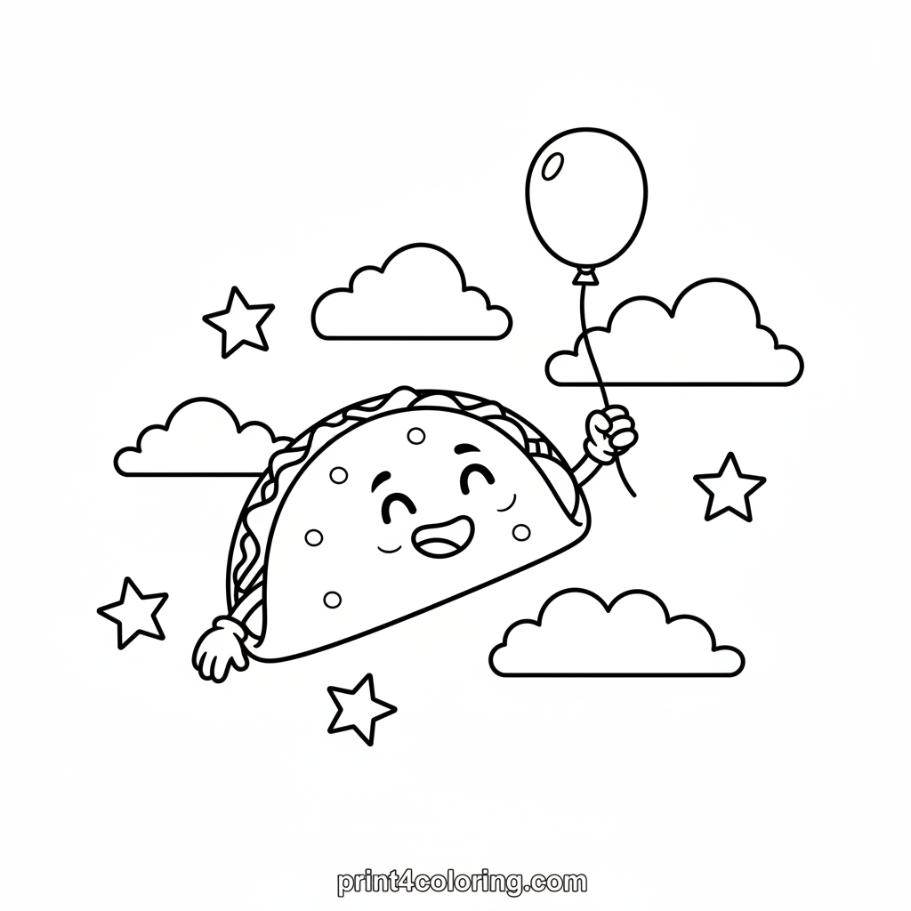 Imagine a super happy taco soaring through a magical sky! This adorable taco is gently floating among fluffy cartoon clouds and twinkling stars, holding onto a tiny, colorful balloon string. With a peaceful smile, it looks like it's having the sweetest dream ever. Get ready to color this whimsical sky adventure!