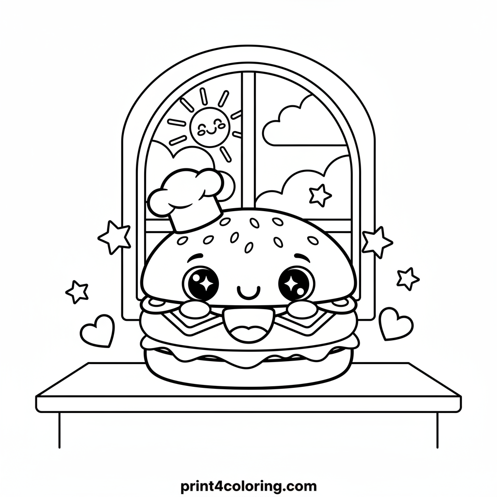 #burger#food#happy#cute#chef#stars#hearts#funny#coloring-page#printable