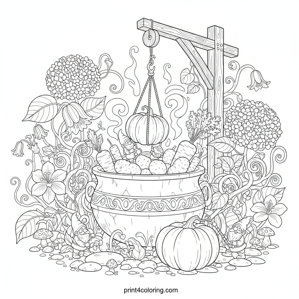Step into a magical, oversized garden! Tiny gnomes are busy preparing a grand soup in an ancient stone cauldron. Colossal carrots, pumpkins, and potatoes are carefully lowered by pulleys. Lush vines and fantastical flowers surround this intricate, whimsical scene, just waiting for your vibrant colors!