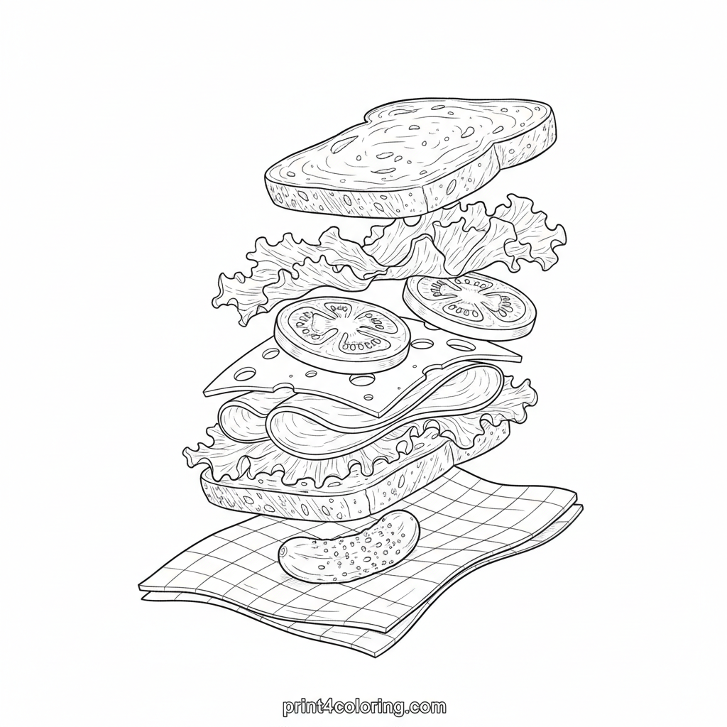 Get ready to color a mouth-watering masterpiece! This expert page features a beautifully layered gourmet sandwich, bursting with fresh whole-grain bread, crisp lettuce, ripe tomatoes, savory ham, and Swiss cheese. A tiny pickle spear rests beside it on a classic checkered napkin, perfect for a sunny picnic.