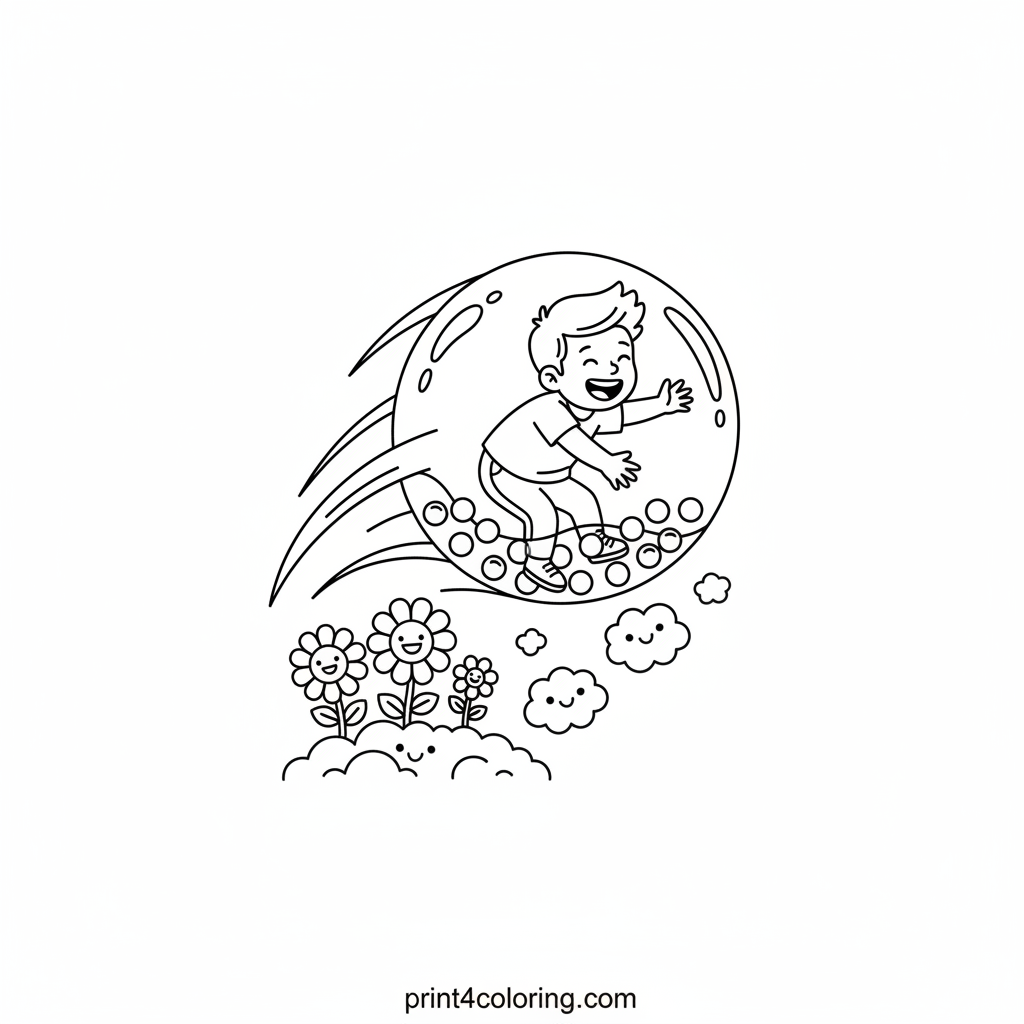 Join a joyful child on a magical adventure, riding inside a giant, clear boba tea bubble! They're floating gently over a whimsical landscape with oversized, vibrant flowers and friendly, fluffy cloud creatures. Use your imagination to color this enchanting, bubbly world and make it truly sparkle!
