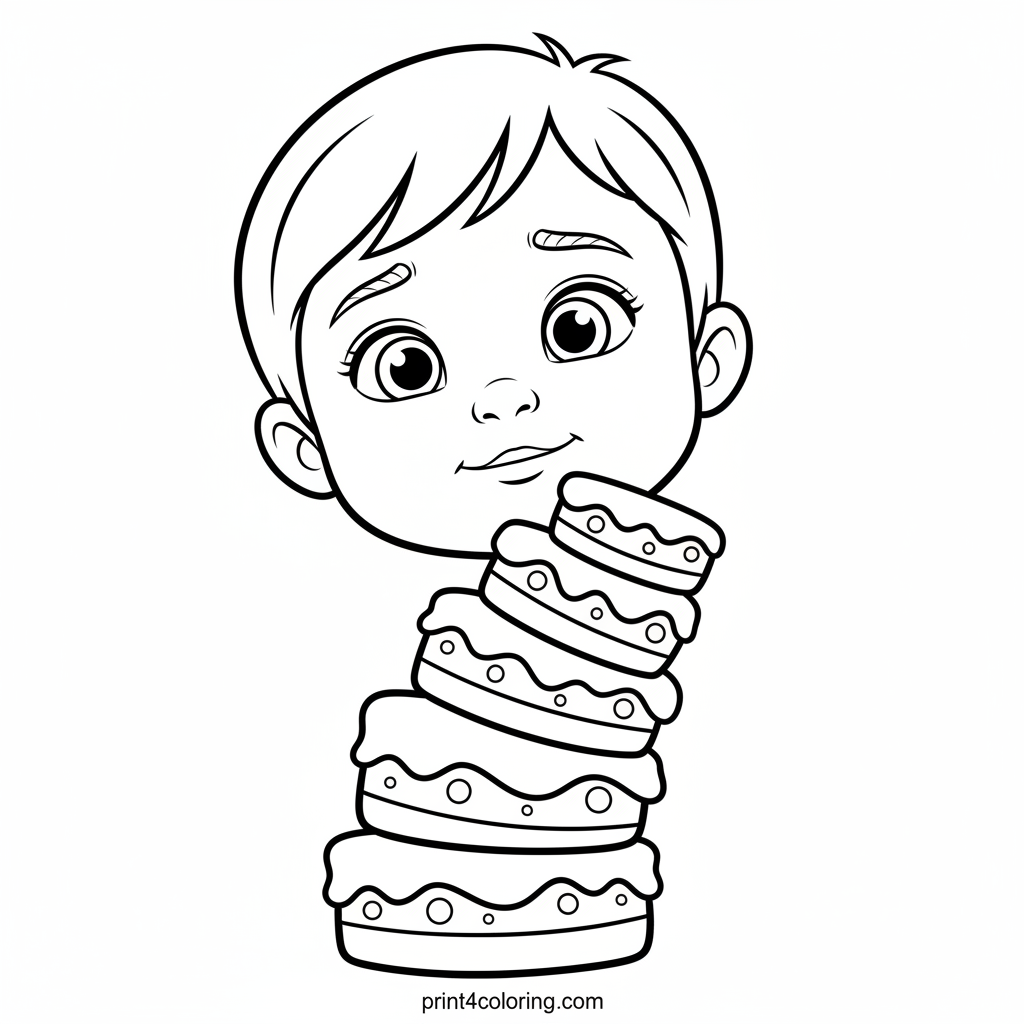 A cheerful character is carefully balancing a tall, wobbly stack of colorful cake layers, trying their best not to let it fall! Bring this delightful, teetering dessert scene to life with your brightest crayons and imaginative colors. Can you help them keep the cakes steady?